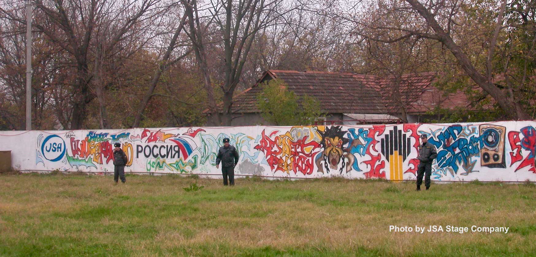 A painted fence at the Lokomotiv stadium in Gudermes, especially for the Phoenix festival. The designs also included a painted JSA logo.