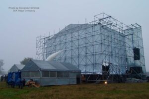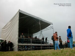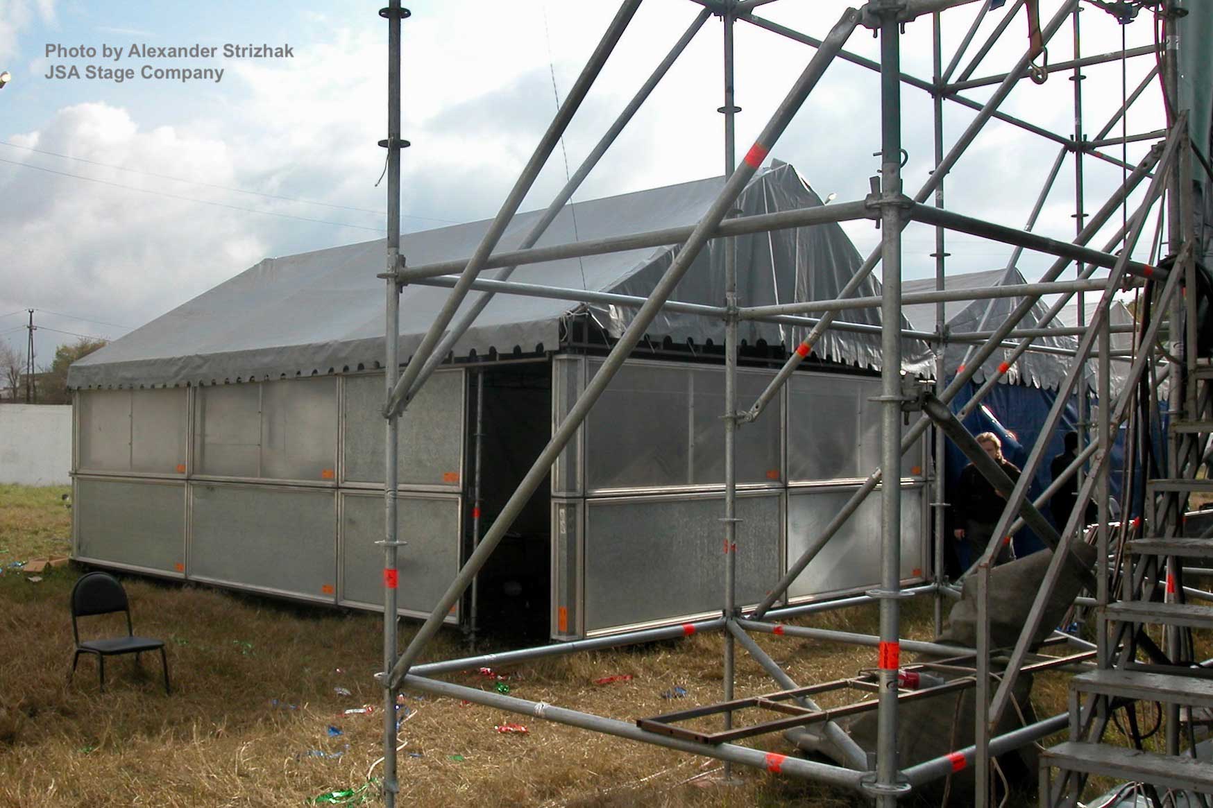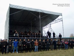 JSA played an active role in the implementation of this complex project. The company was responsible for all technical support issues and production logistics. Our team constructed a temporary stage structure on the stadium field using Layher systems with a Prolyte roof (20m x 14m). Several performer tents were erected behind the stage, one of which (the main tent) was assembled from Layher elements, including Layher Protective panels.