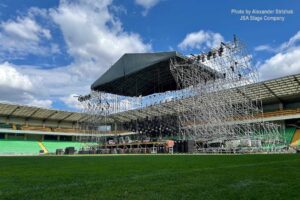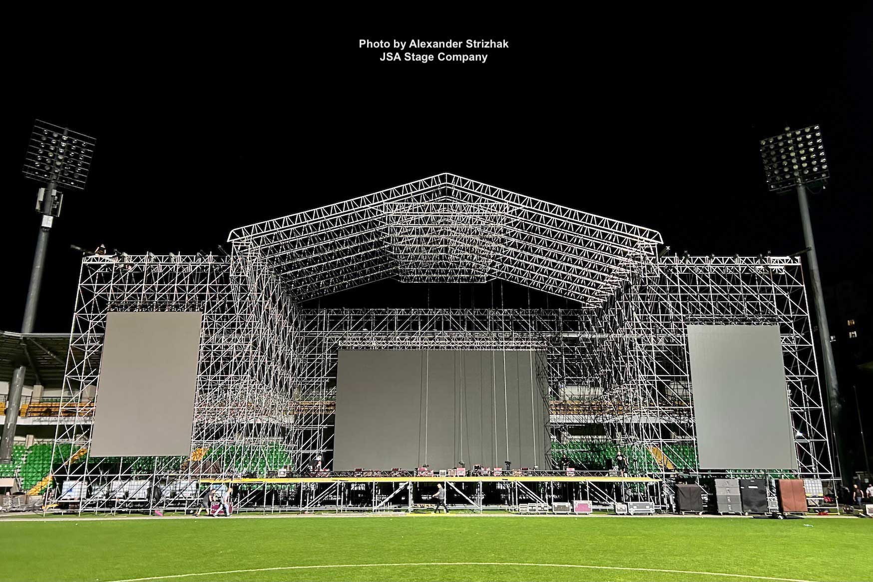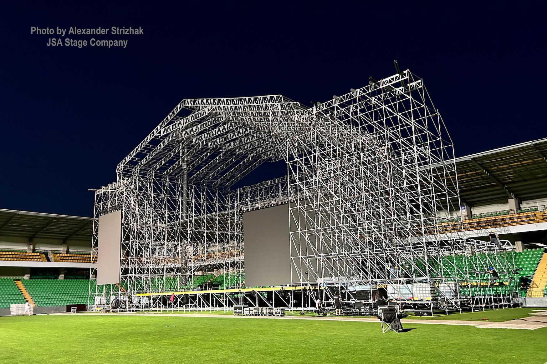 The installation of the stage, towers, and other equipment (lighting, sound, screens) took place within a relatively short timeframe and under specific conditions, as working on the football field required adherence to specific regulations and a schedule related to its coverage and preservation for subsequent matches. The roof system was installed using a special, unique crane.